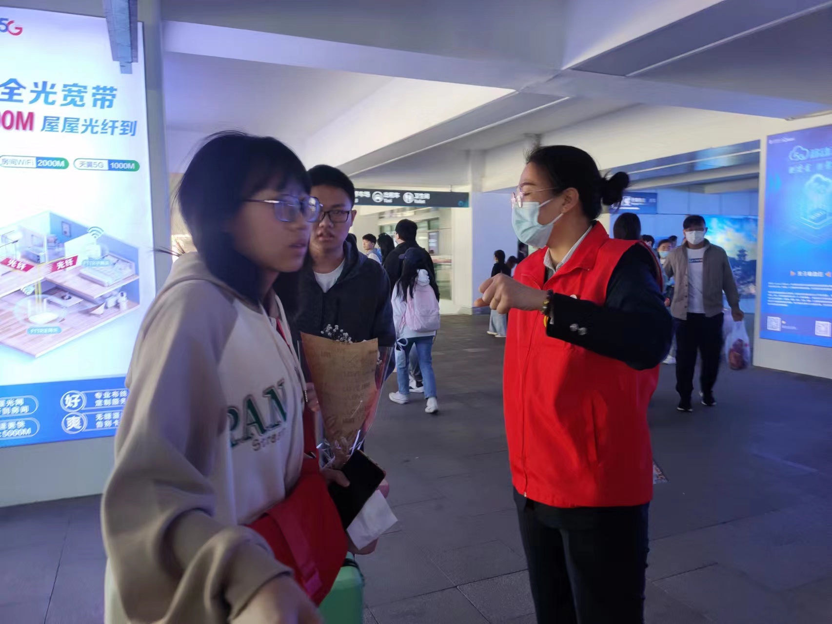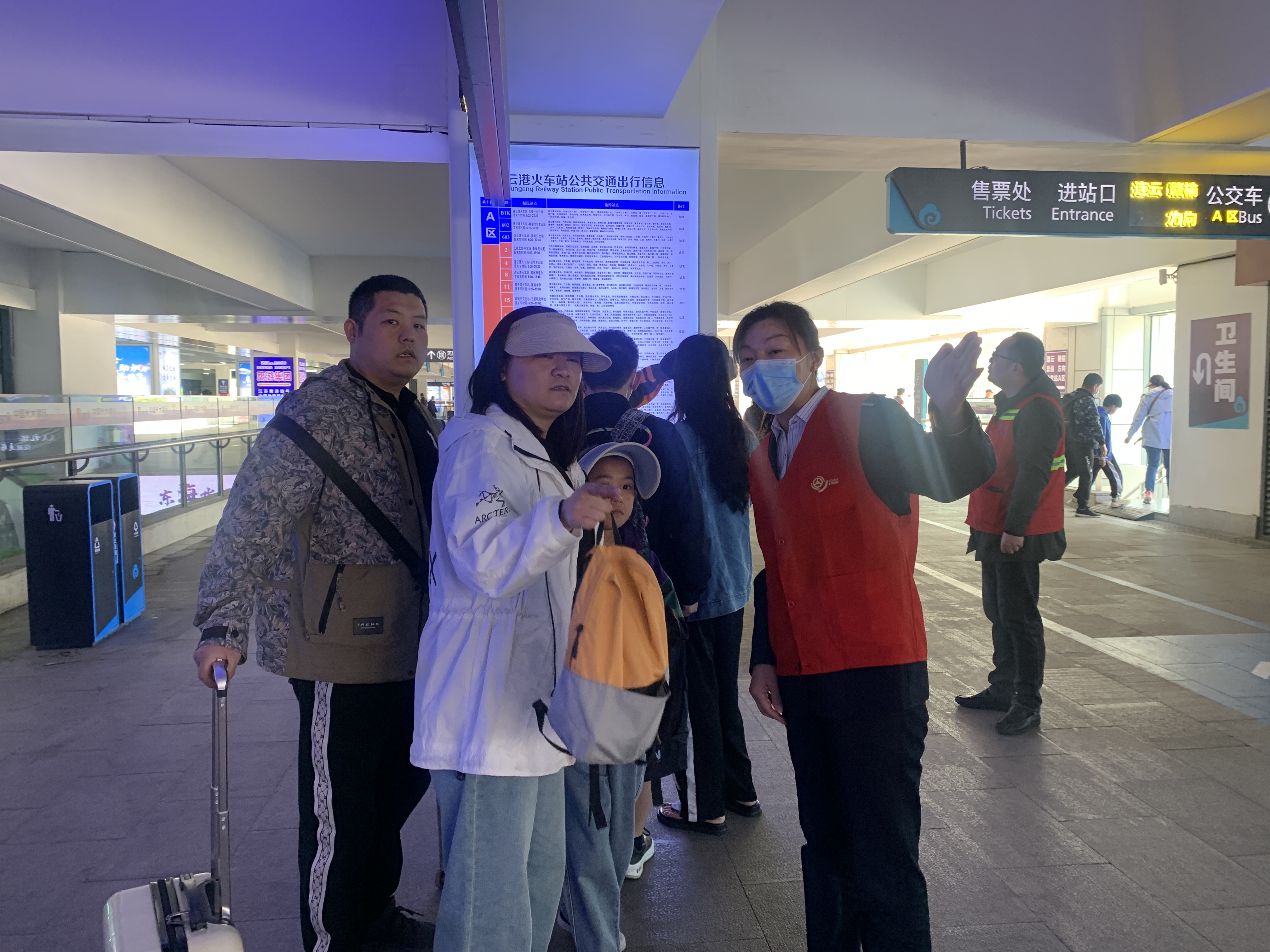 5月1日上午,在高铁站的出站口,“雷锋车”组的“红马甲”们面带微笑,耐心地为来连旅客提供免费休息、导乘、旅游推荐、免费换乘接送等“保姆式”便民服务。