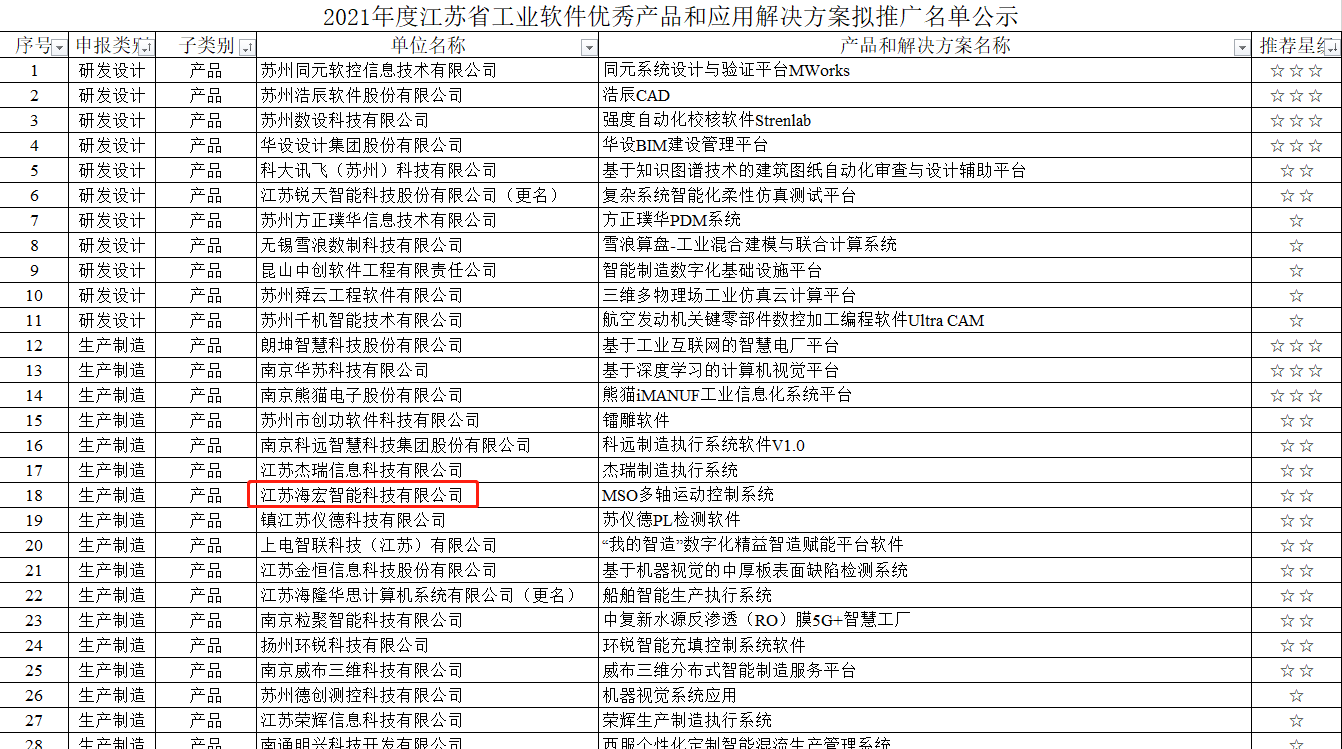 日前,江苏省工信厅公示了“2021年度江苏省工业软件优秀产品和应用解决方案拟推广名单”,江苏海宏智能科技有限公司(以下简称“海宏科技”)的产品“MSO多轴运动控制系统”成功入选。