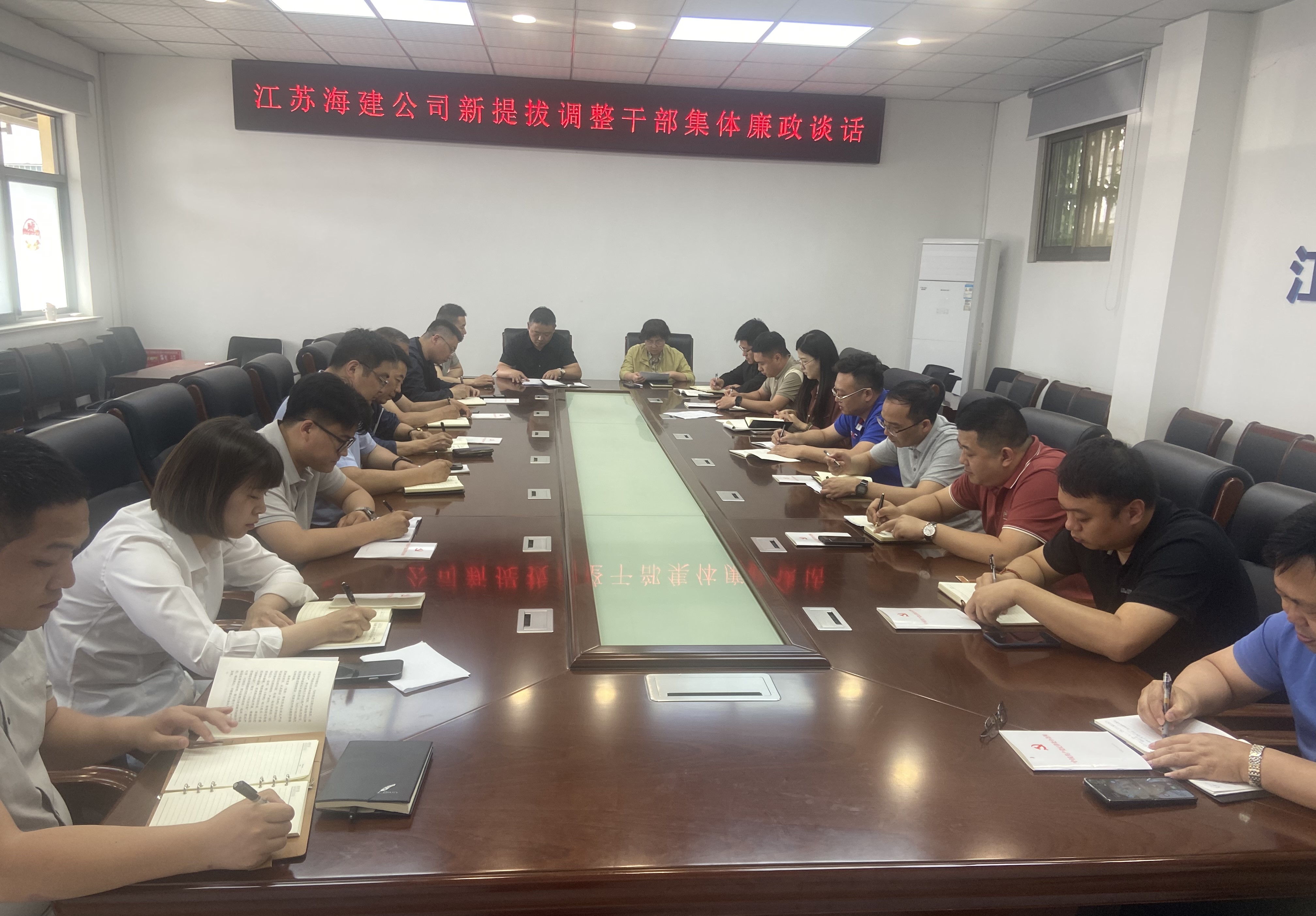 近日,江苏海建公司纪委组织召开新任职干部集体廉政谈话,公司纪委书记韦晓燕出席会议并对参会的17名干部进行集体廉政谈话,公司纪委办及新提拔(调整)干部参加会议。